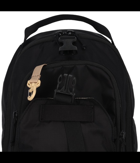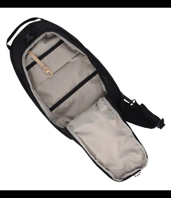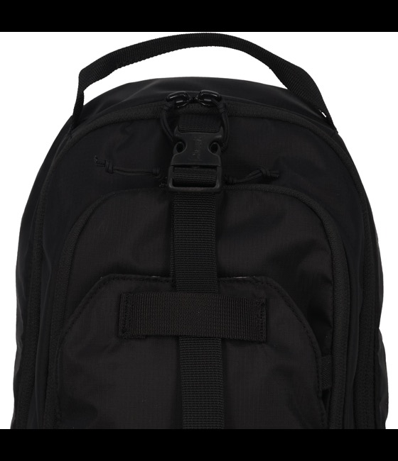 140デニールの軽量ナイロン「MINI RIP NYLON」を使用した、使い勝手の良いスリングバッグ。最大の特徴は、フロントに備えた500ml程度のペットボトルが入るスリーブポケット。ジッパーポケット内にはキーフックに加え、2つのスリーブポケットとファスナーのないセキュリティースリーブを備え、小物を整理しやすい仕様になっています。メイン収納は大きなスリーブポケット付きのシンプルな構造で、荷物をすっきりまとめやすいのも魅力。背面とショルダー裏は通気性に優れたメッシュ仕様で、ショルダーは左右付け替え可能。日常使いから週末の外出まで活躍する、軽量ワンショルダーバッグです。